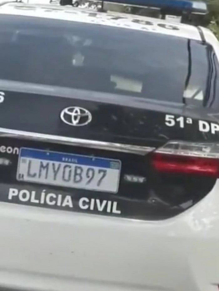 O veículo tem a inscrição da 51ª DP (Paracambi). Na imagem é possível ver uma movimentação no banco traseiro da viatura, placa LMYOB97. No final do vídeo, o homem filmado vai para frente do carro e sai dirigindo.