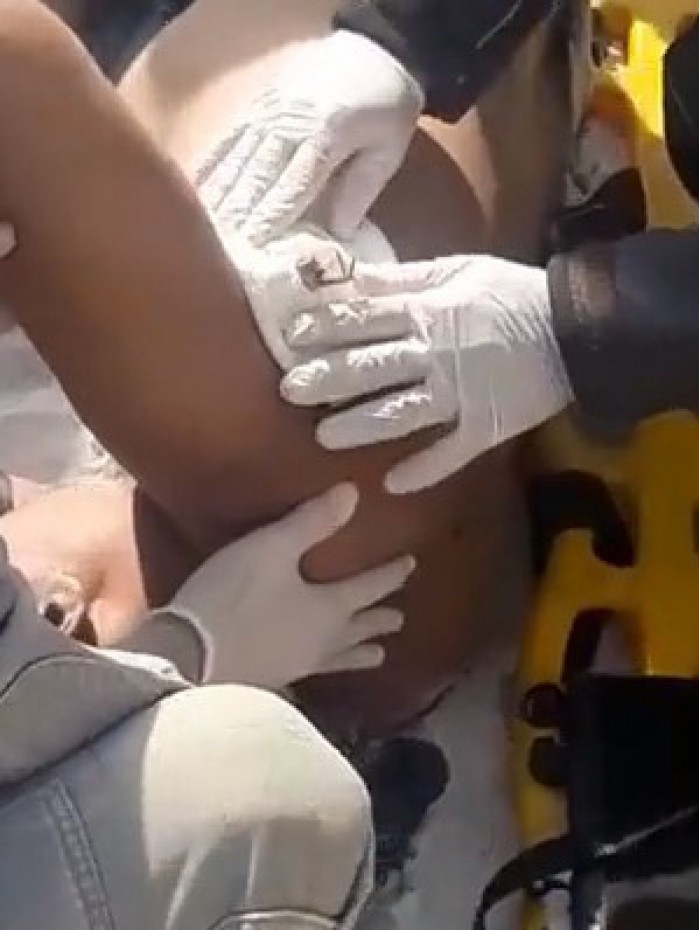 Vídeos mostram o momento em que os bombeiros realizam o socorro do banhista, que ficou ferido na axila direita, momentos depois do incidente.