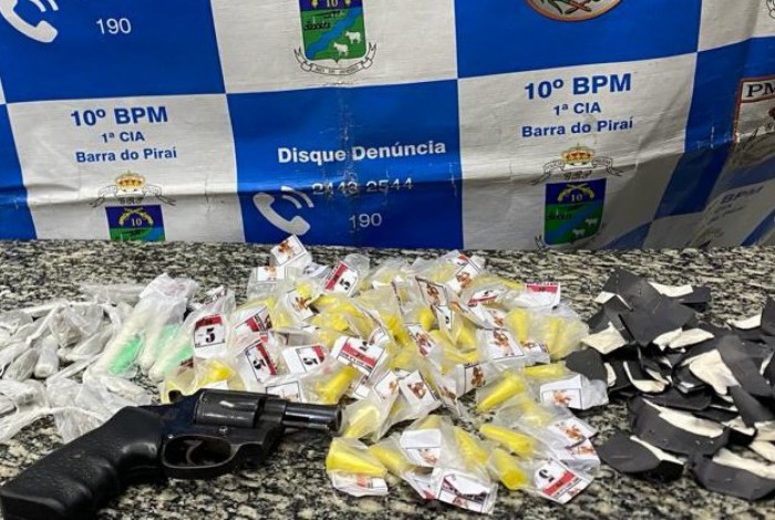 Drogas e arma apreendidas com suspeito preso, acusado de vender drogas no Centro de Barra do PiraíDivulgação / PMERJ
