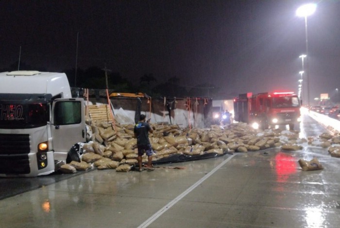Segundo o Centro de Operações Rio (COR), a carga contendo carboato em pó, que estava no caminhão, tombou na pista, interrompendo o trânsito no local.