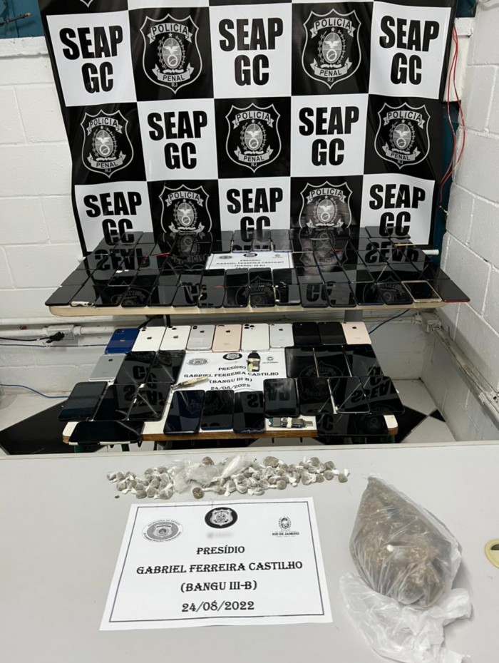 Rio - Policiais penais da Secretaria de Estado de Administração Penitenciária apreenderam 104 celulares no presídio Gabriel Ferreira Castilho, conhecido como Bangu 3, no Complexo de Gericinó, Zona Oeste do Rio, na manhã desta quarta-feira (24). Grande parte dos aparelhos estava escondida atrás das chapas de aço que revestem as celas.