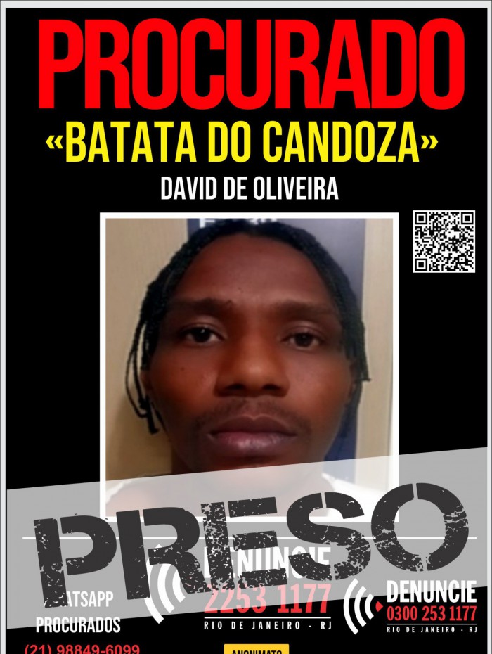 Rio´- Policiais Militares do 7ª BPM (São Gonçalo), com informações passadas pelo Disque Denúncia, prenderam, nesta quarta-feira (23), na Estrada dos Coqueiros, no bairro Coelho, em São Gonçalo, Região Metropolitana do Rio de Janeiro, o traficante foragido da Justiça, David de Oliveira, mais conhecido pelo apelido de 'Batata do Candoza', de 35 anos. Ele seria braço direito do traficante Levi da Cruz Rebello, de 34 anos, o 'Levi da Alma', chefe do tráfico no Morro da Alma e preso desde outubro de 2013.