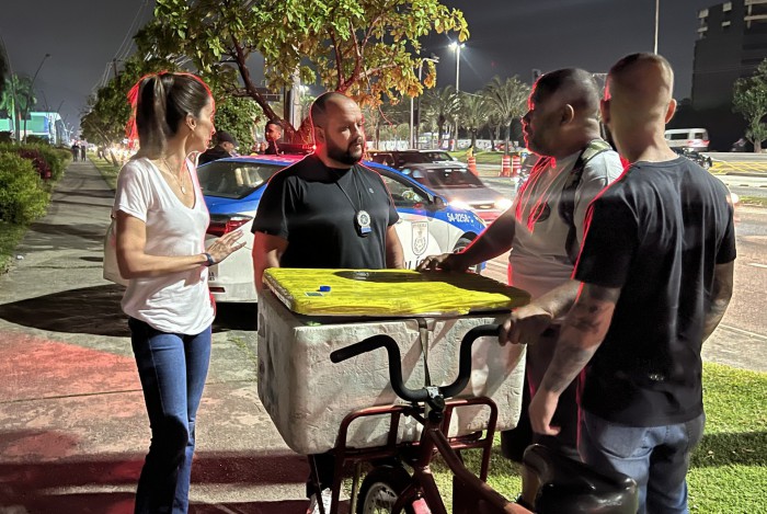 Agentes descaracterizados prenderam o homem no ponto de vendar. A ação resultou na apreensão de mais de 20 adesivos falsos. Ele foi levado imediatamente para o JECRIM da Cidade do Rock e a Secretaria de Ordem Pública apreendeu a bicicleta com os produtos que ele vendia ilegalmente.