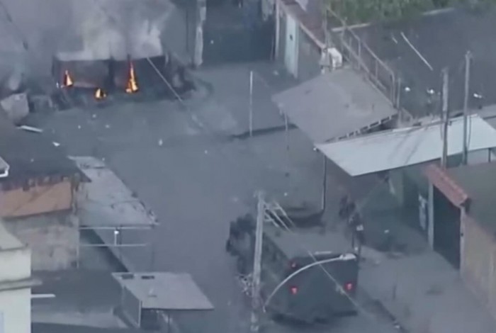 Durante a operação, um blindado da PM precisou ultrapassar uma barricada em chamas colocadas por criminosos, no acesso à comunidade.