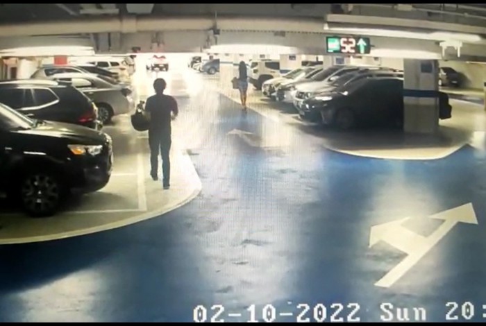 Nas imagens é possível ver Felipe circulando pela escada rolante do shopping próximo às cabines de pagamento de estacionamento até avistar uma mulher de calça azul e camisa branca indo em direção ao estacionamento.