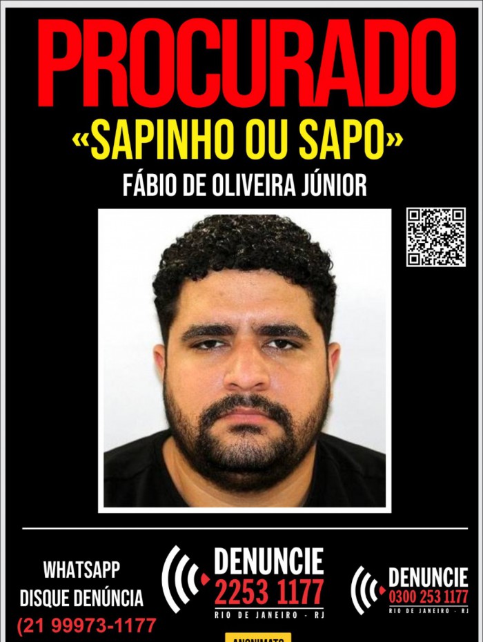 Rio - O Disque Denúncia divulgou, neste sábado (08), o cartaz de Fábio de Oliveira Júnior, de 28 anos, suspeito por atirar e matar um homem após uma confusão em bar, na Barra da Tijuca, Zona Oeste do Rio. Mais conhecido como "Sapo" ou "Sapinho", ele é o principal envolvido da morte de Bruno Alves da Silva, conhecido como "Gêmeos" ou "Boy Play", 38, com oito tiros. O caso aconteceu na madrugada do último dia 3 de setembro.