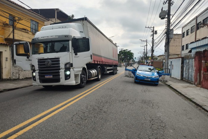 Carreta roubada com carga de bebidas foi recuperada na Rua Clarimundo de Melo, no EncantadoFoto: Divulgação/Pmerj