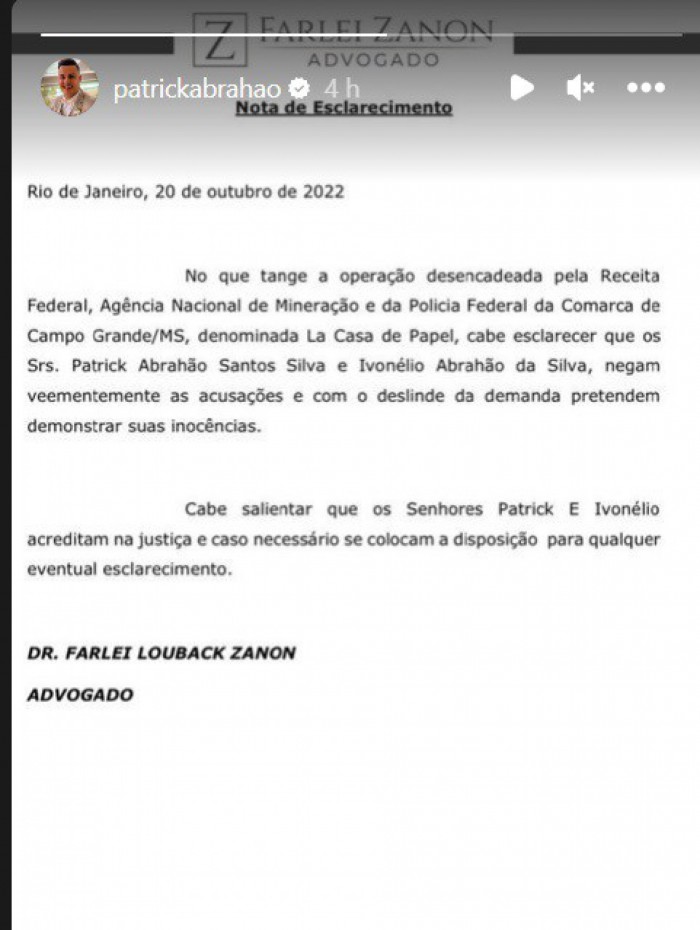 "No que tange à operação desencadeada pela Receita Federal, Agência Nacional de Mineração e da Polícia Federal da Comarca de Campo Grande (MS), denominada La Casa de Papel, cabe esclarecer que os srs. Patrick Abrahão Santos Silva e Ivonélio Abrahão da Silva negam veementemente as acusações e, com o deslinde da demanda, pretendem demonstrar suas inocências".