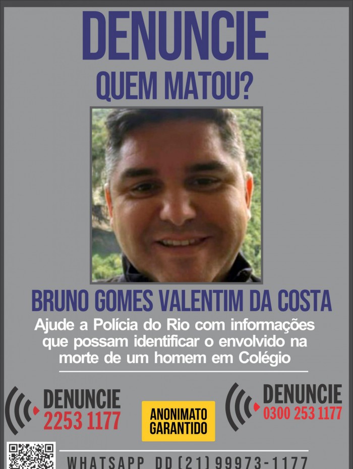Rio – O Disque Denúncia divulgou, nesta terça-feira (25), um cartaz para ajudar a Delegacia de Homicídios da Capital (DHC) a obter informações que levem à identificação e prisão do responsável pela morte de Bruno Gomes Valentim da Costa, de 41 anos, vítima de um tiro à queima-roupa na noite da quarta-feira passada (19), no bairro de Colégio, Zona Norte do Rio.