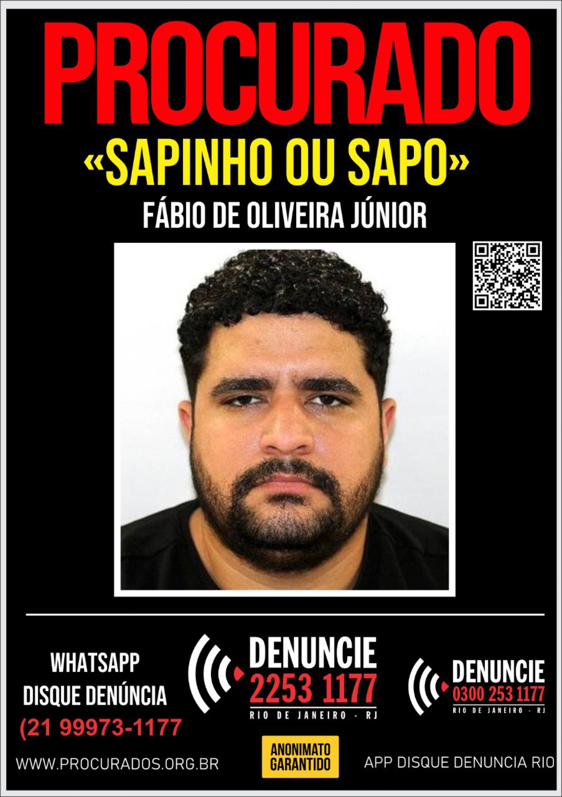 Rio - O Disque Denúncia divulgou, neste sábado (08), o cartaz de Fábio de Oliveira Júnior, de 28 anos, suspeito por atirar e matar um homem após uma confusão em bar, na Barra da Tijuca, Zona Oeste do Rio. Mais conhecido como "Sapo" ou "Sapinho", ele é o principal envolvido da morte de Bruno Alves da Silva, conhecido como "Gêmeos" ou "Boy Play", 38, com oito tiros. O caso aconteceu na madrugada do último dia 3 de setembro.