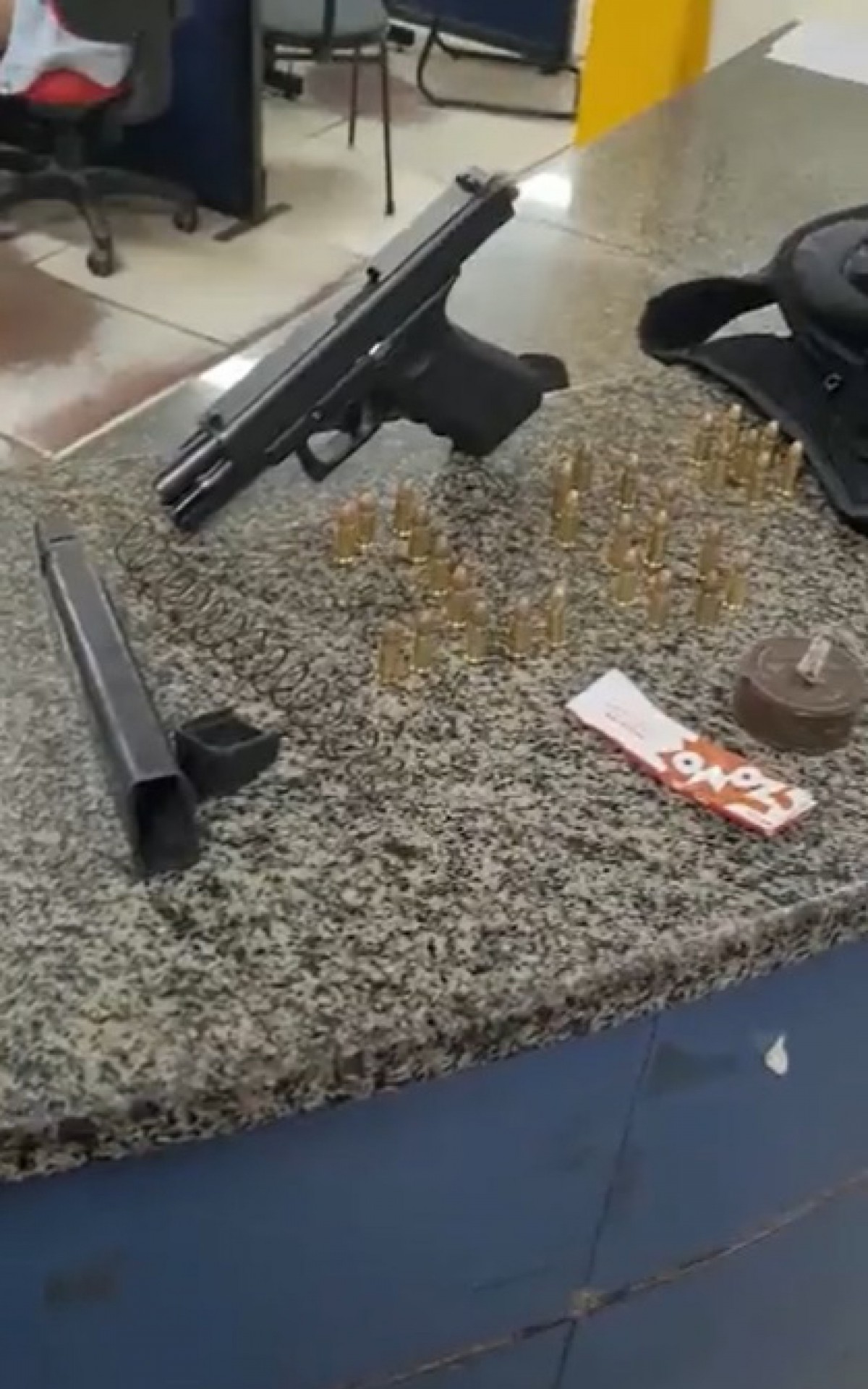 Após a abordagem, os policiais encontraram uma arma e seis celulares dentro de uma mochila. Os agentes verificaram que a moto era roubada e foi apreendida.
