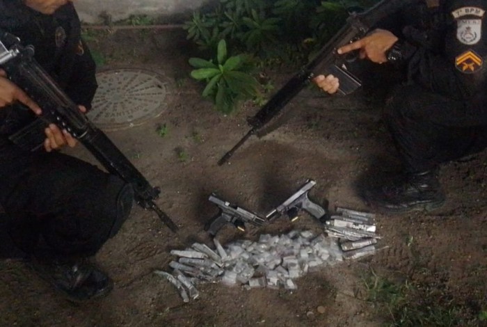 Foram apreendidas duas pistolas, munições e 136 embalagens de erva prensada que, segundo a polícia, possivelmente seria maconhaDivulgação / PMERJ