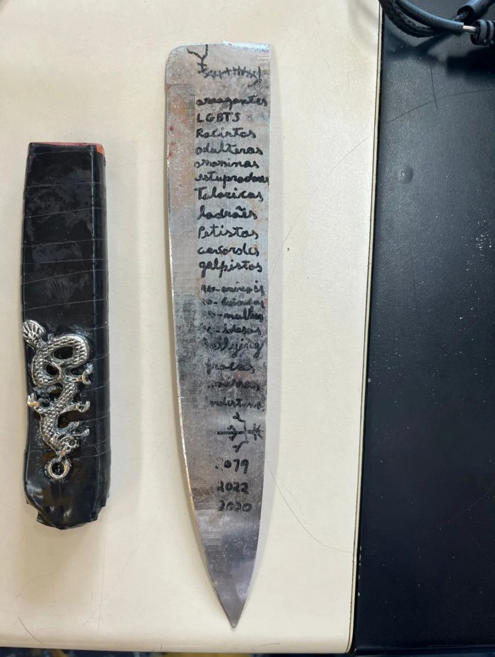 A arma usada na tentativa de feminicídio a uma adolescente de 15 anos foi encontrada com o autor; na faca, inscrições como 'LGBTS', 'Petistas', 'Adúlteros', entre outrosDivulgação