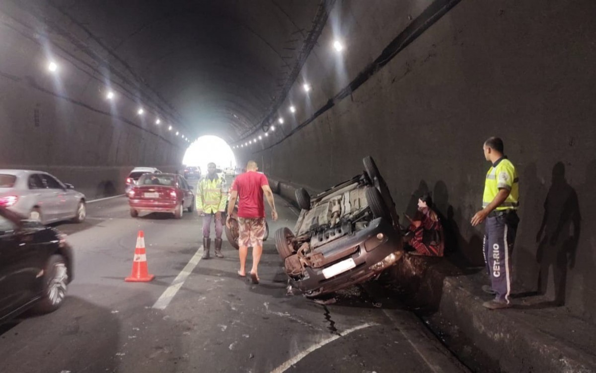 Rio - Um carro capotou no Túnel Rebouças, na manhã desta sexta-feira (2). Dois veículos colidiram na primeira galeria da via, no sentido Centro, causando o capotamento de um deles.
