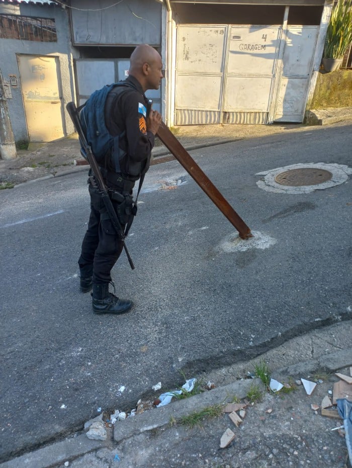 De acordo com a Polícia Militar, no Morro dos Bancários, na Ilha do Governador, a ação foi realizada pelo 17º BPM (Ilha do Governador), que retira barricadas. As equipes apreenderam também cinco carregadores de arma de fogo, munições, duas capas de colete, um cinto tático, três máquinas caça-níqueis e 136 trouxinhas de maconha.