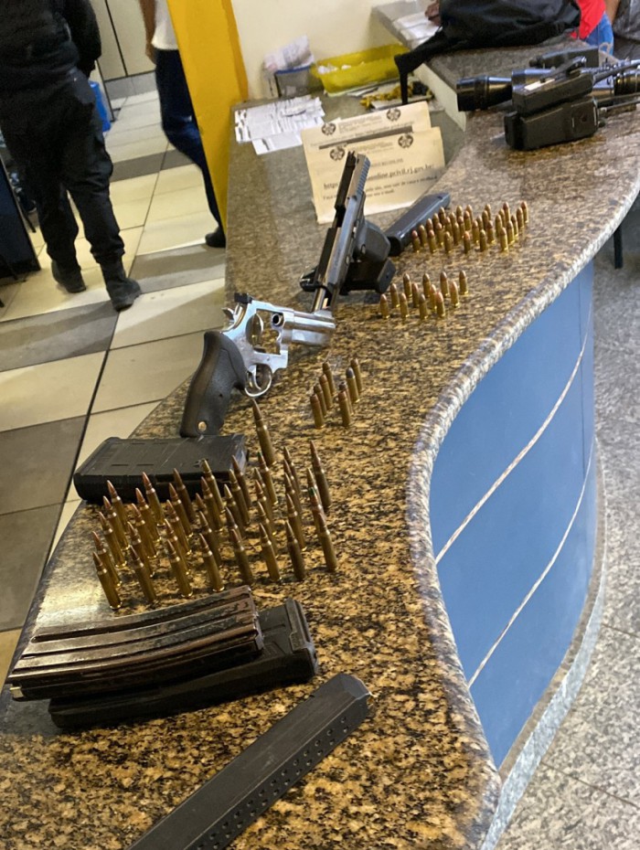 - 4 carros - 2 motos - 1 fuzil AR 15, calibre 556, sem numeração - 1 carregador de fuzil calibre 556 - 25 munições calibre 556 - 1 pistola da marca Glock G22, calibre 40, sem numeração - 1 carregador de Glock, calibre 40 - 2 carregadores de fuzil/FAL, calibre 762 - 1 capa de colete - 1 colete balístico - 1 pistola calibre 9mm - 2 carregadores alongados de pistola 9mm - 1 binóculo - 1 luneta - 1 revólver calibre 38 - munições calibre 762 - farto fardamento