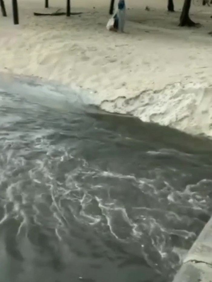 Em um vídeo divulgado nas redes sociais, um morador mostra a grande quantidade de água suja indo em direção ao mar.