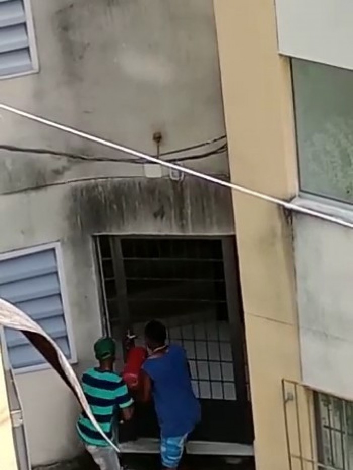 Dupla usou extintor para arrombar portão de bloco no condomínio Residencial Bella VistaReprodução de vídeo