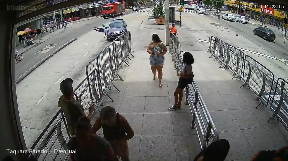 Os motorista e o passageiro do carro saíram do veículo para ajudar a mulher. Outras pessoas, que aguardavam o BRT na estação, também se aproximam da vítima.