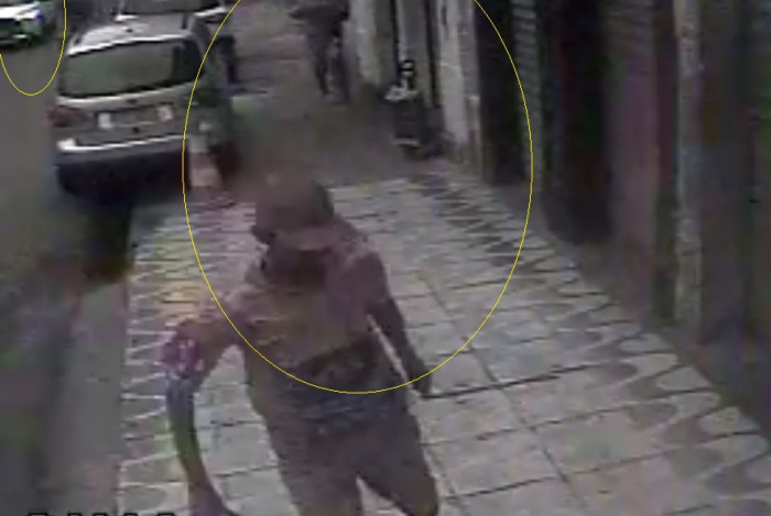 As imagens mostram um homem usando um boné correndo de outros três, armados, quando um disparo atinge a calçada. Ele consegue desviar e continua fugindo, enquanto um veículo branco do tipo utilitário acompanha os suspeitos. De outro ângulo, é possível ver que uma mulher que se preparava para atravessar a rua parece se assustar e entra na padaria. Percebendo a movimentação do lado de fora, funcionários e clientes que estavam no estabelecimento tentam se proteger.