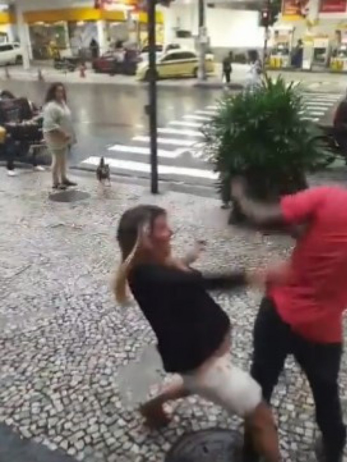 O entregador foge de um dos ataques e diz: "Tira a mão de mim mulher". Um grupo de pessoas que estava no entorno grita para ele se afastar dela: "Sai de perto dela. É isso que ela quer".