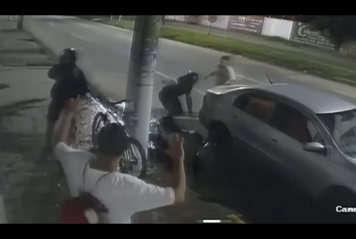 Uma das vítimas chegou a descer do veículo para ver o que havia acontecido. Logo depois da queda, um dos assaltantes, que estava armado, deixa a moto e aborda um homem que estava na calçada, enquanto sua dupla levanta a moto que estava no chão. O primeiro suspeito ainda revista outra vítima.