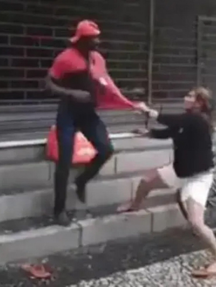 Em outras imagens, é possível ver a mulher puxando e agredindo o entregador, que é negro. Ela dá um soco nele, o agarra pela roupa e, em seguida, ele se esquiva e se afasta. Sandra então, diz: "Tu (sic) não vai embora não, filha da p...". O vídeo continua e mostra a suspeita tirar a guia de um cachorro. Ela pega o objeto e parte para cima da vítima, que fala: "Teu caô não é comigo não. Tu vai me agredir? Vai me agredir?". A nutricionista retruca: "Não é contigo, não?" e, logo na sequência, atinge o homem com a coleira.