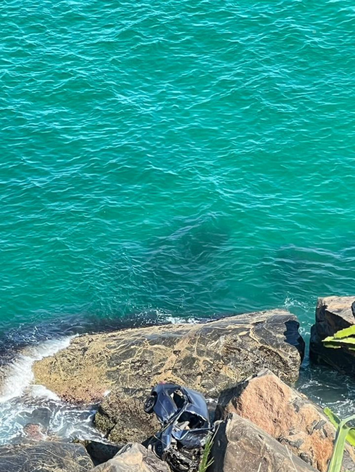 O carro ficou preso entre as pedras na costa da praia. Não há informações sobre o que motivou o acidente.