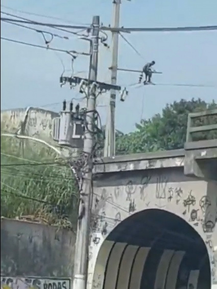 Rio - Um homem foi flagrado, na manhã desta terça-feira (9), furtando cabos de energia de um poste na Avenida Dom Hélder Câmara, na altura do Jacarezinho, na Zona Norte do Rio. Um vídeo que circula nas redes sociais mostra o momento que o criminoso, munido de um alicate e sem camisa, coloca a vida em risco ao se pendurar no alto do poste para cortar os cabos.