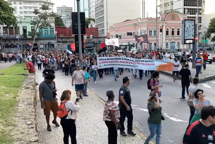 Os profissionais da rede estadual de educação realizaram uma passeata em direção à Alerj após decidirem por manter a greve em uma reunião na Lapa. Diversos cartazes cobrando investimentos do Governo do Rio foram levados para o ato.