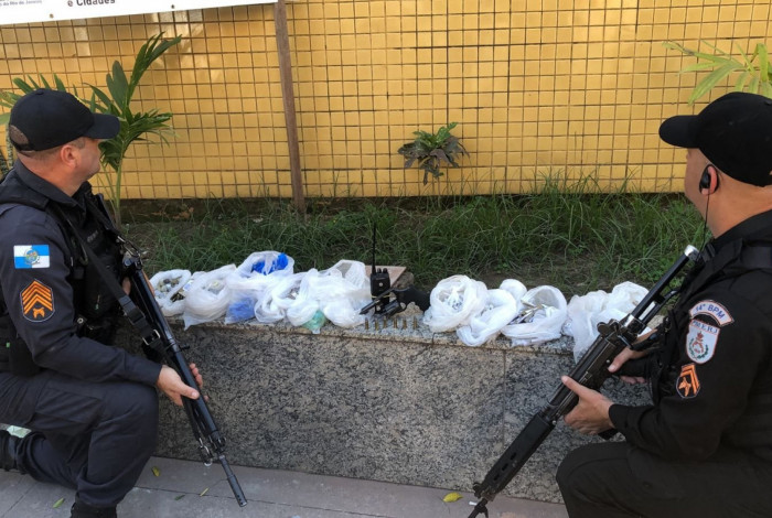 Segundo o 14° BPM (Bangu), com o suspeito, foram apreendidos uma arma de fogo, munições, um rádio transmissor e farto material entorpecente.