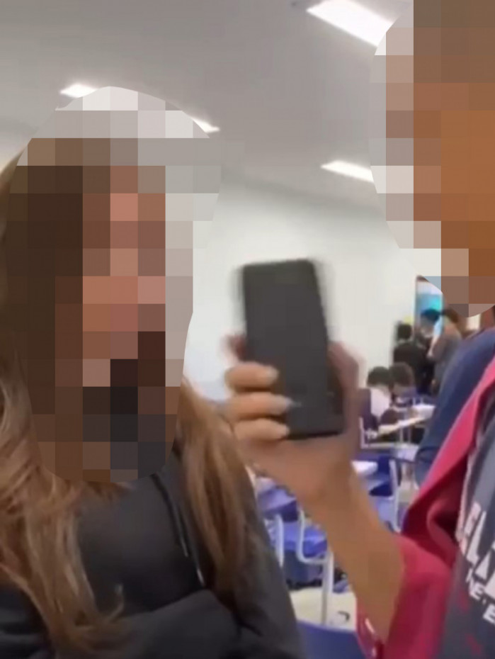 Nas imagens, um aluno do Colégio Elite parece simular um programa de entrevistas onde pergunta a opinião de colega sobre a saída de uma professora. A estudante xinga a profissional e segue atacando outros membros do corpo letivo.