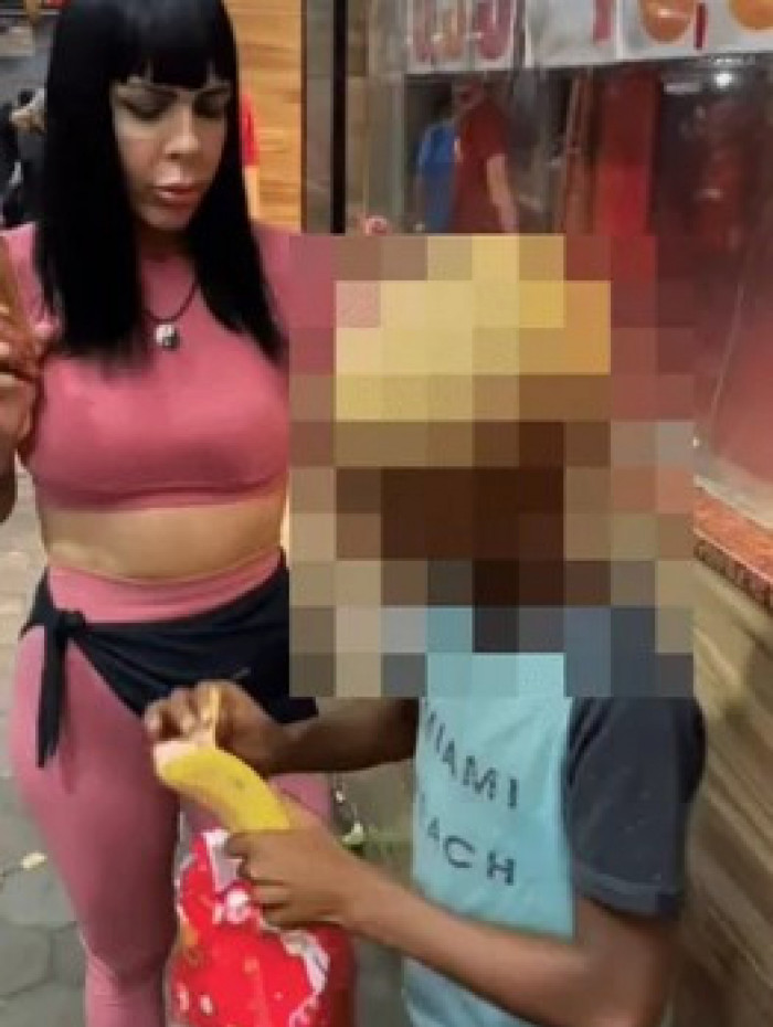 Nas imagens, Kérollen conversa com um menino negro em uma calçada e pergunta se ele gostaria de ganhar um presente ou R$ 10. Ele escolhe o presente, mas, quando percebe que era uma banana, responde 'só isso?' e demonstra que não gostou e sai.