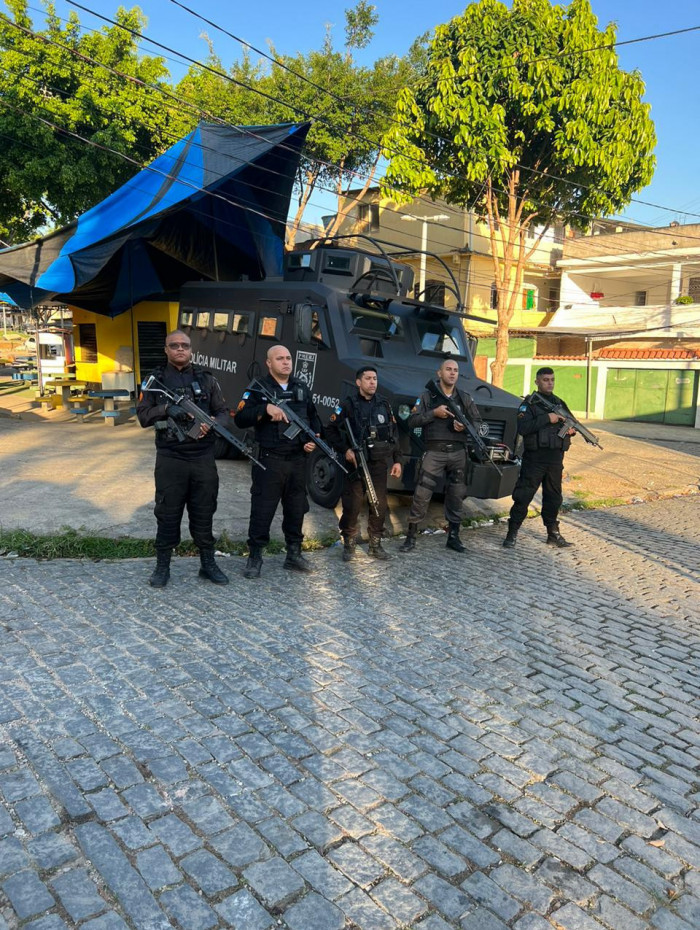 Na Praça Seca, agentes do 18º BPM (Jacarepaguá) e do 2º Comando de Policiamento de Área fazem patrulhamento no Morro do Bateau Mouche. Um veículo blindado dá apoio às ações dos militares. No mesmo bairro, no Morro do Barão, agentes do 9º BPM (Irajá) também fazem patrulhamento.
