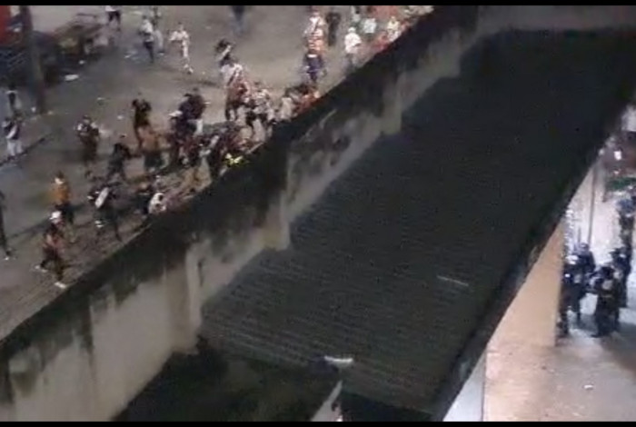 Em um vídeo que circula nas redes sociais, é possível ver que uma dezena de torcedores jogam objetos e bombas dentro de um dos portões de acesso ao estádio. Um policial, que estava na parte de dentro com a equipe do Batalhão Especial de Policiamento em Estádios (BEPE), efetua disparos de arma de fogo contra o grupo.