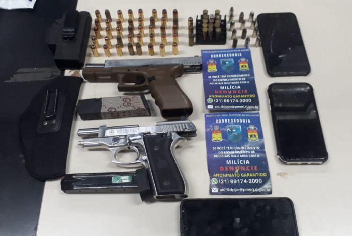 Com base em informações passadas pelo Disque Denúncia de que um grupo de milicianos estaria realizando cobranças aos moradores e comerciantes da região, os policiais conseguiram localizar e abordar os suspeitos, em um veículo, na Estrada dos Bandeirantes, em Curicica. Com eles, foram localizados duas pistolas com numeração raspada, munições e dois aparelhos celulares.