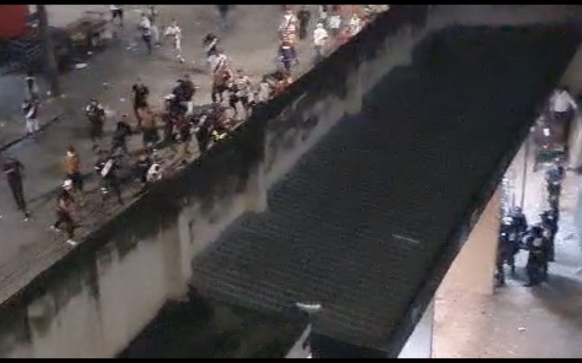 Em um vídeo que circula nas redes sociais, é possível ver que uma dezena de torcedores jogam objetos e bombas dentro de um dos portões de acesso ao estádio. Um policial, que estava na parte de dentro com a equipe do Batalhão Especial de Policiamento em Estádios (BEPE), efetua disparos de arma de fogo contra o grupo.
