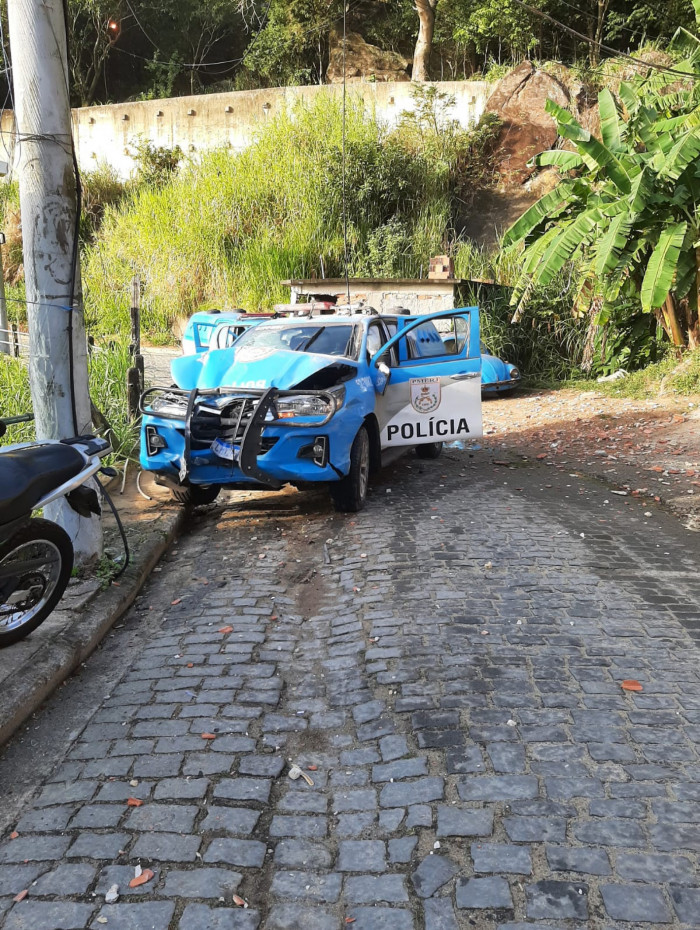 Segundo a corporação, equipes da UPP Andaraí precisaram realizar uma rápida manobra para deixar o local e colidiram em uma edificação. Pelas imagens, é possível ver que o veículo ficou com a parte da frente destruída. Apesar disso, não houve registro de feridos na ação.
