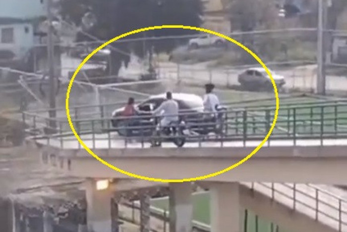 No vídeo, é possível ver um veículo preto tentando subir a passarela, enquanto dois pedestres também passam por ela. Um deles parece se espremer na lateral do automóvel para conseguir passar. No mesmo momento, há um motociclista tentando descer pelo local. "Quando pensa que viu de tudo, olha só, o carro tentando subir a passarela", diz a pessoa que registrou o momento.