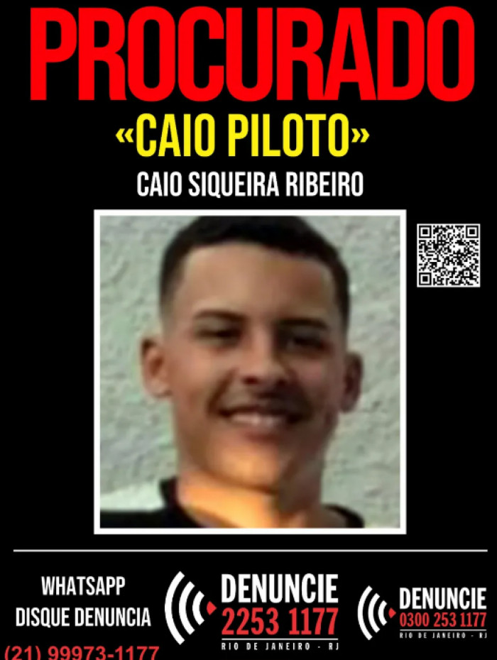 Rio - O Disque Denúncia reforçou que continua buscando informações para auxiliar a Delegacia de Homicídios da Capital (DHC) a prender Caio Siqueira Ribeiro, o Caio Piloto, de 24 anos. Ele é suspeito de envolvimento em, pelo menos, três assassinatos na Zona Oeste do Rio, sendo um deles o do policial militar inativo Marco Antônio Pisente Canário, em 2021.