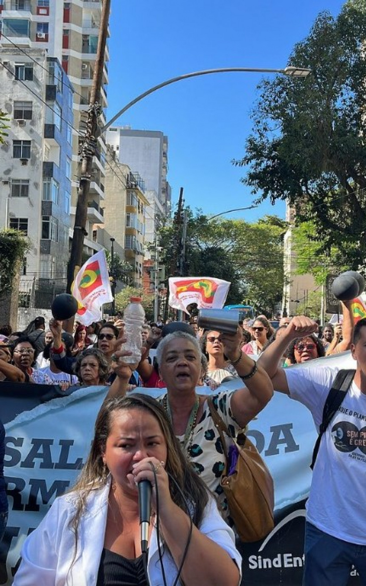 Rio - Um grupo de profissionais da enfermagem protesta, desde o fim da manhã desta quinta-feira (6), pelas ruas de Botafogo, Zona Sul do Rio. A manifestação convoca enfermeiros e técnicos de enfermagem para greve em busca da implementação do piso nacional aprovado no Congresso Nacional.