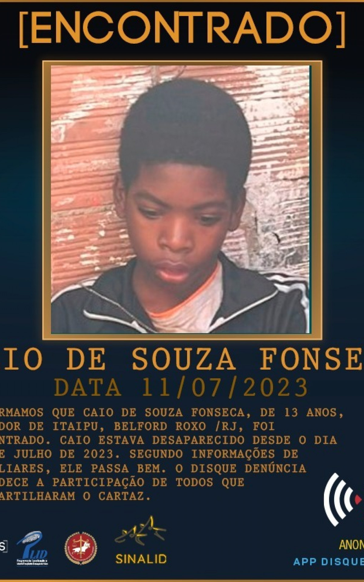 Rio - O adolescente Caio de Souza Fonseca, de 13 anos, desaparecido desde o domingo passado (9), foi encontrado nesta terça-feira (11). De acordo com o Disque Denúncia, uma informação recebida pelo portal levou à localização do menor no bairro de Austin em Nova Iguaçu.