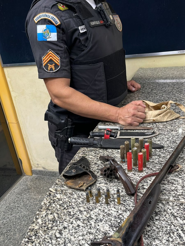 No local, o homem foi preso e, com ele, foram apreendidos um revólver, uma espingarda, munições e três facas. A ocorrência foi encaminhada para a 168ª DP (Rio Claro).