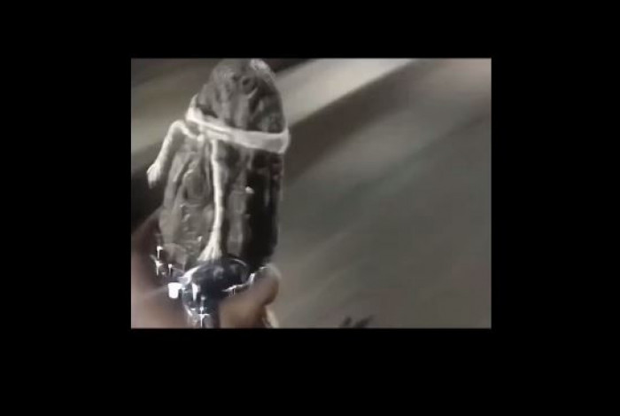 Jacaré com coleira é carregado por motociclista na Zona Oeste. A Delegacia de Proteção ao Meio Ambiente (DPMA) investiga o caso.