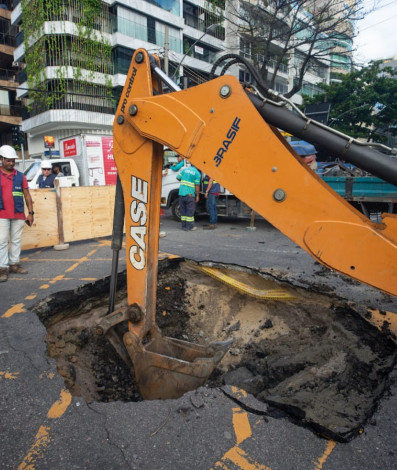 A equipe do DIA esteve no local e presenciou funcionários da Secretaria de Conservação e também da concessionária Águas do Rio já trabalhando para reparar o asfalto. Uma escavadeira era usada no serviço da empresa.