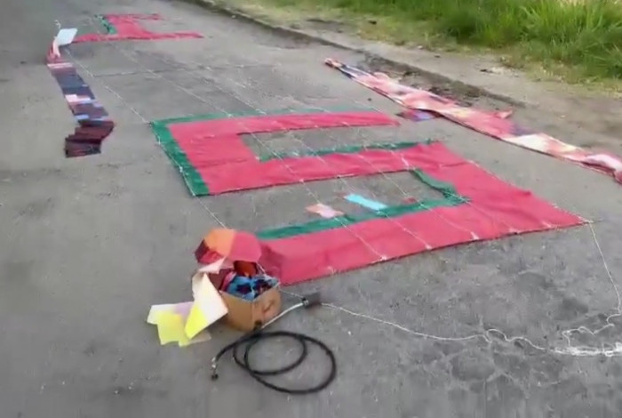 Agentes do 9º BPM (Rocha Miranda) realizavam patrulhamento quando perceberam homens terminando de confeccionar o material, que tinha as letras "S" e "J", em homenagem a São Jorge.
