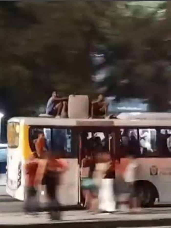 Imagens mostram os veículos lotados, trafegando com passageiros no teto Divulgação