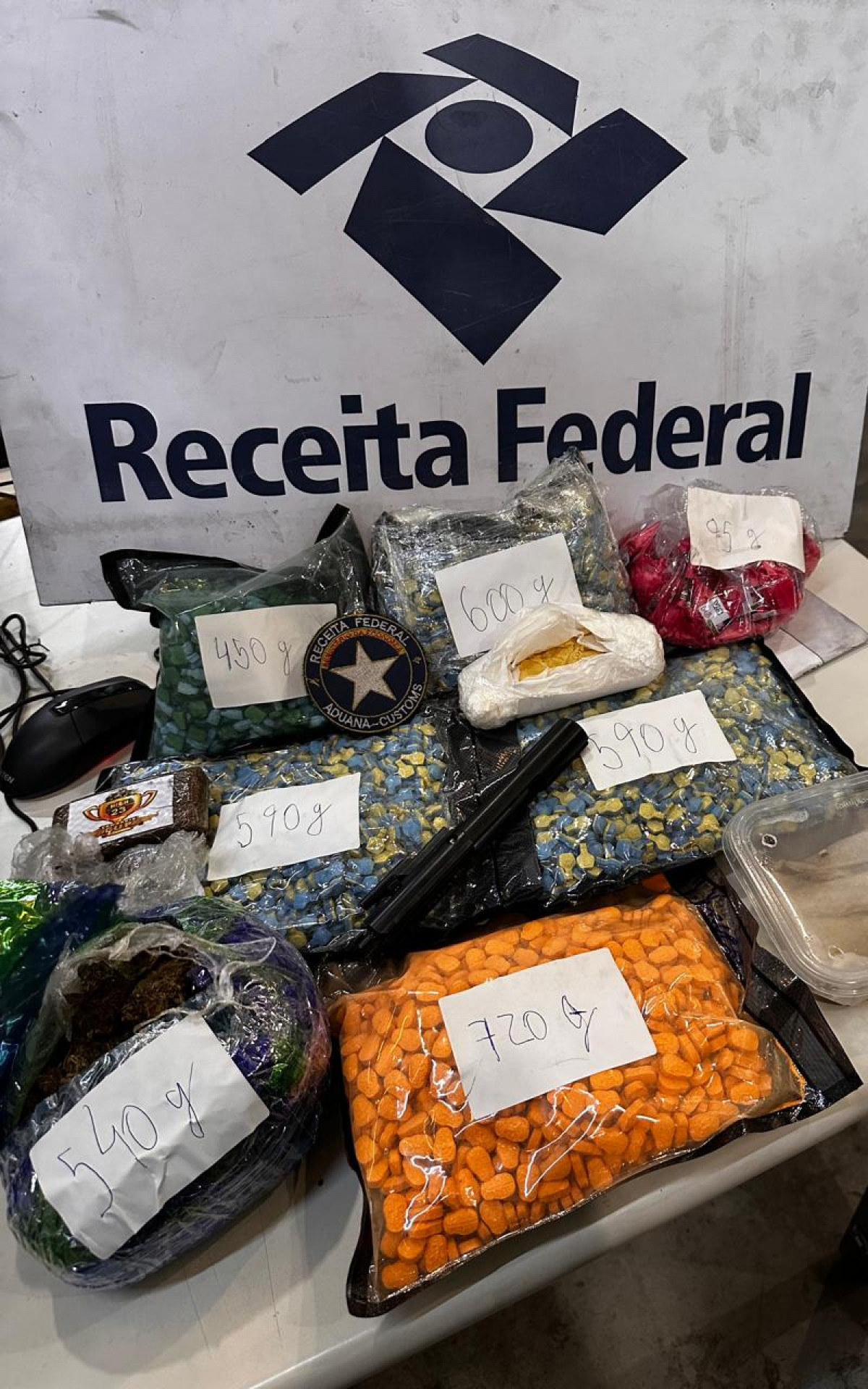 Após o trabalho de fiscalização e inspeção realizada com base em gerenciamento de risco, foi encontrada, em uma única encomenda, 3 kg de ecstasy, 540 gramas de skunk, 95 gramas de cocaína, 265 gramas de haxixe, 20 gramas de MDMA, uma peça de fuzil M16 e um filhote de lagarto.