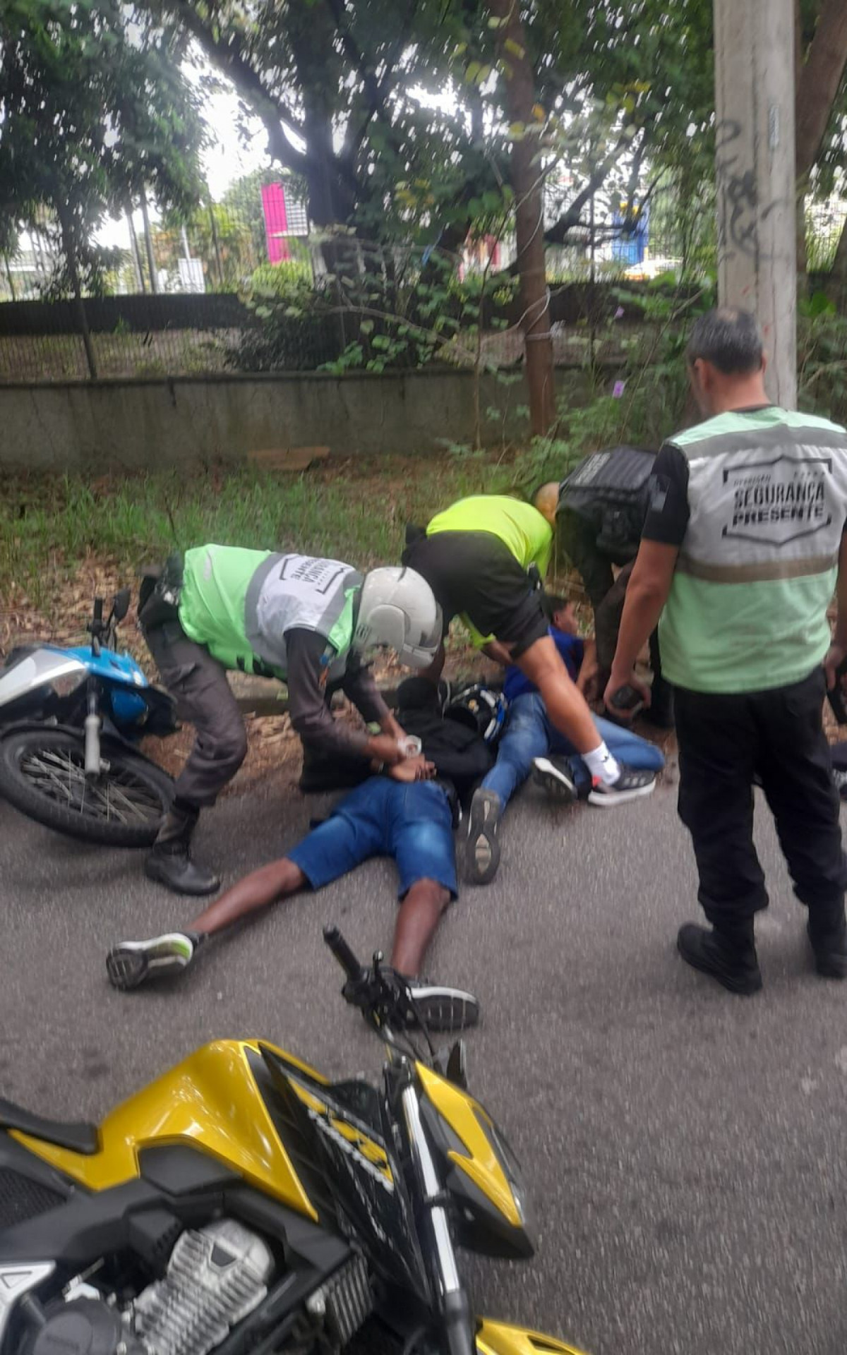 Durante a tentativa de fuga, a pasta informou que um dos homens jogou uma pistola com número de série raspado e carregador alongado em um canteiro na Avenida das Américas. A moto que eles estavam tinha uma fita adesiva preta a cobrindo.