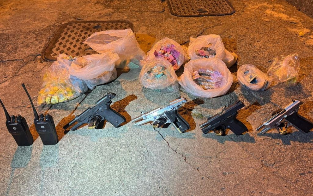 Também houve a apreensão de quatro pistolas, rádios transmissores e drogas prontas para comercialização - a polícia não informou a quantidade.